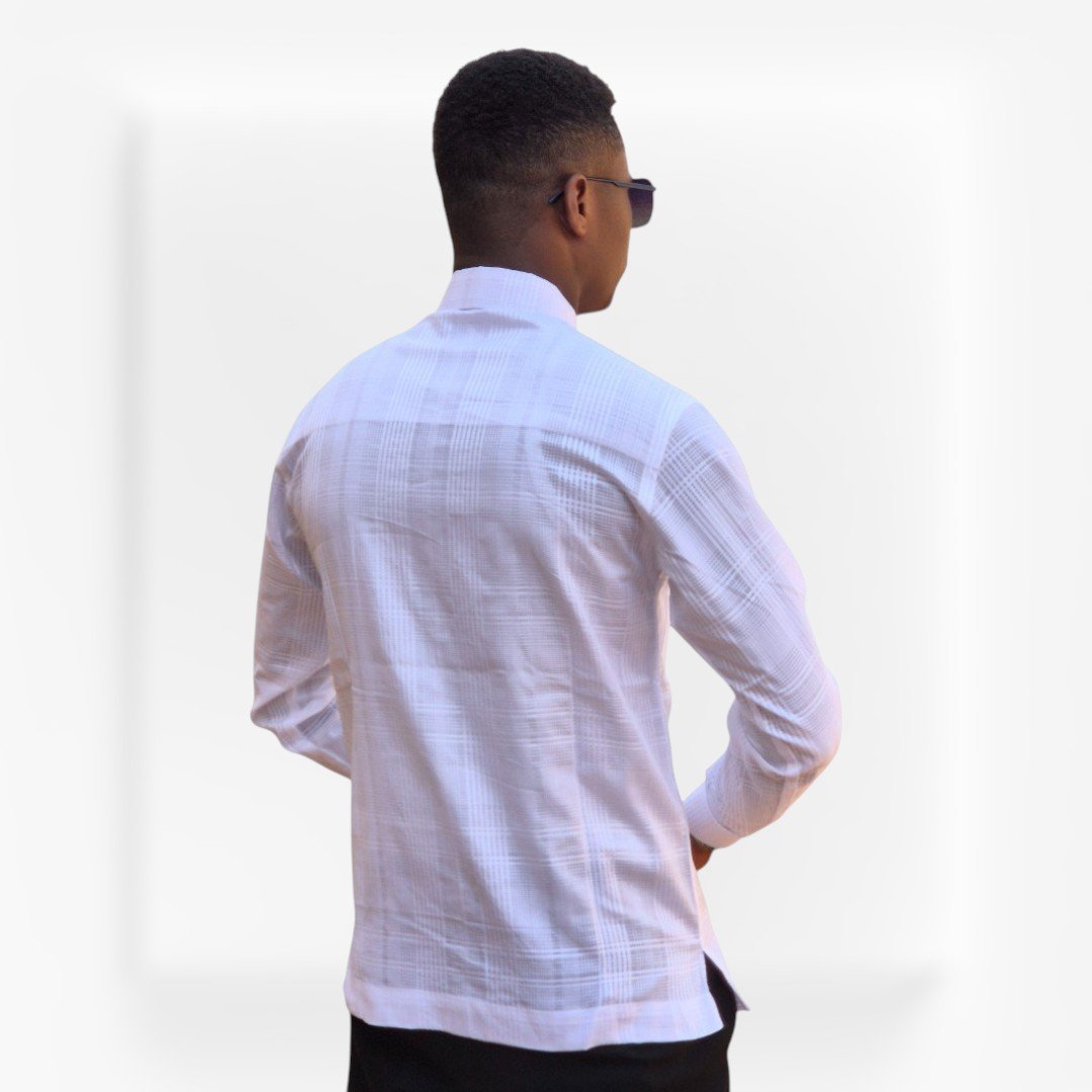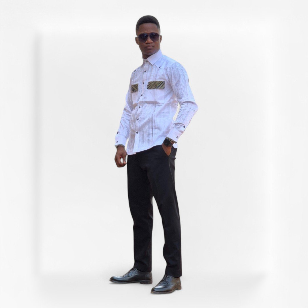 Caractéristiques : Type : Chemise manches longues pour homme Couleur principale : BlancMotif : Fines rayures verticales et horizontales formant un quadrillage discret Col : Classique à pointes Fermeture : Boutonnière centrale avec boutons noirs Détails distinctifs : Poches : Deux poches poitrine plaquées avec rabats, chacune décorée d’un empiècement rectangulaire en tissu rayé (jaune, noir et blanc) Épaules : Épaulettes décoratives dans le même tissu rayé, ajoutant une touche de caractère Poignets : Détail en tissu rayé rappelant les poches, pour une finition cohérente et élégante Finitions : Surpiqûres noires apparentes sur les poches et les épaules, soulignant les lignes structurantes de la chemise Style & Occasions : Cette chemise incarne une rencontre entre la mode urbaine contemporaine et les inspirations traditionnelles. Elle s’associe aussi bien avec un pantalon habillé pour un look formel qu’avec un jean pour un style casual chic.