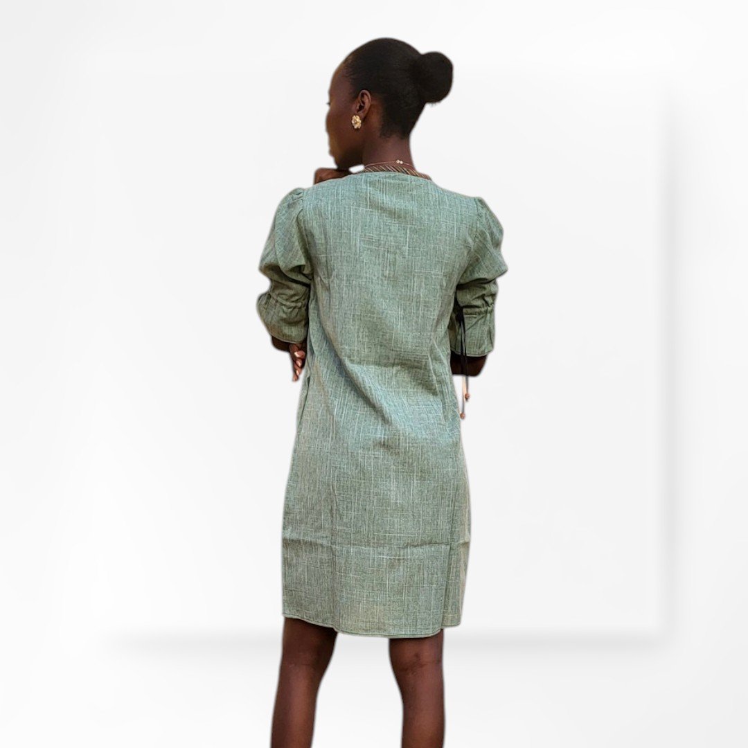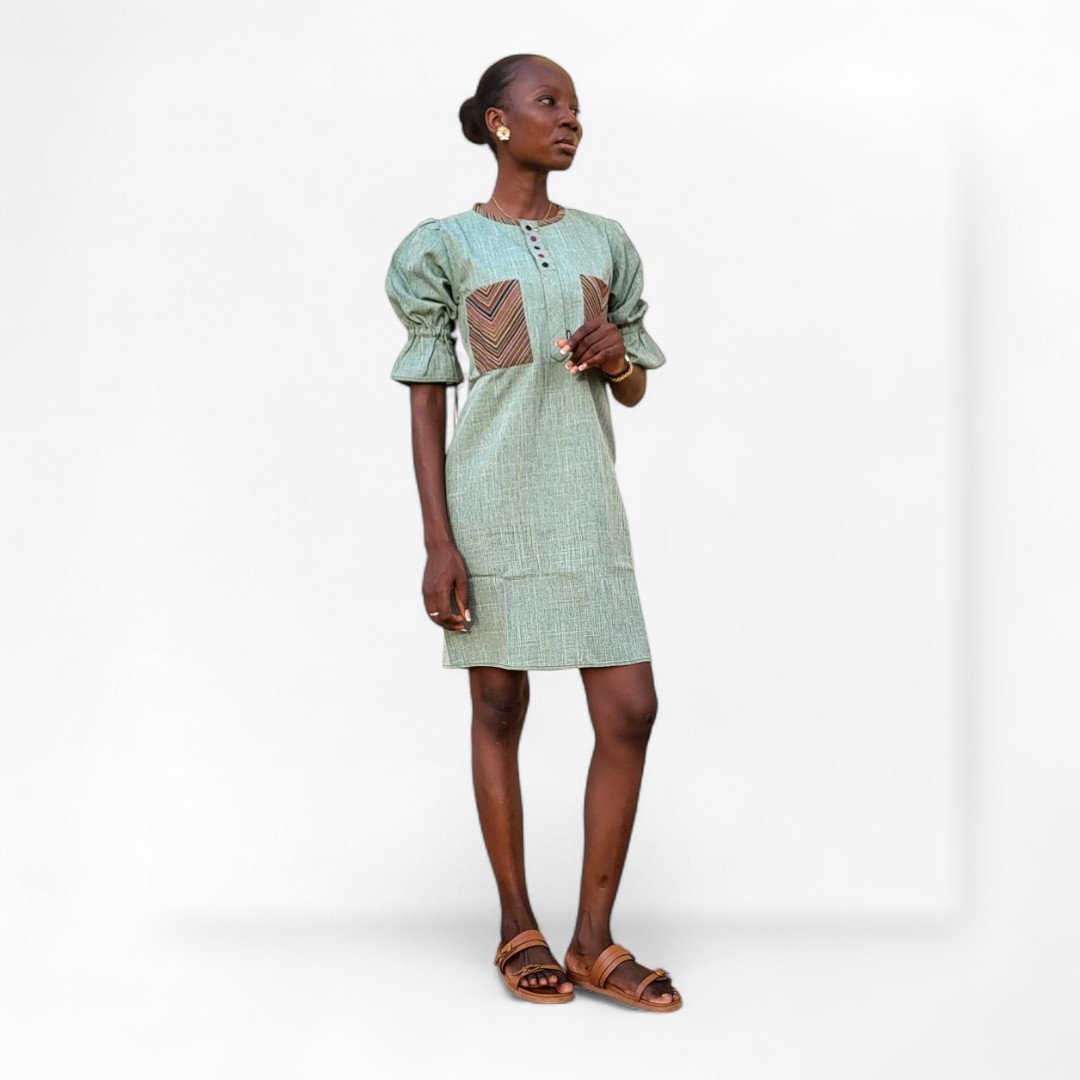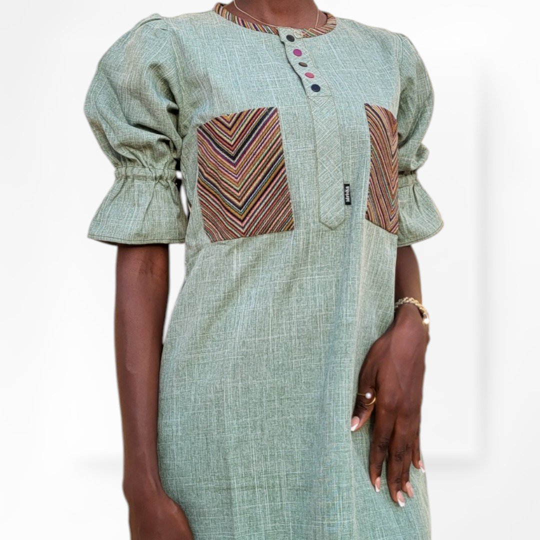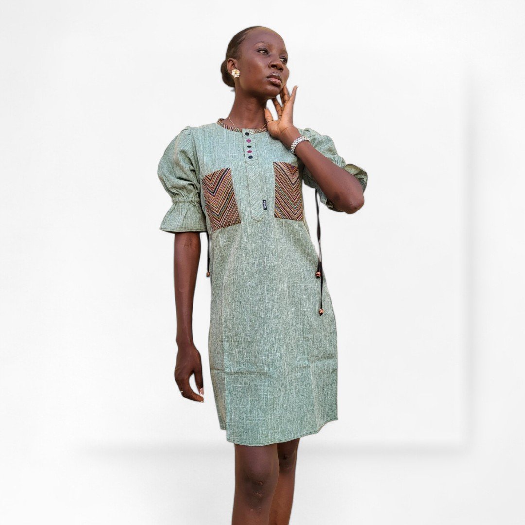 Caractéristiques principales : Type : Robe courte pour femme Coupe : Droite, légèrement ample pour un confort optimal Tissu principal : Vert chiné à effet texturé subtil Col : Rond agrémenté d’une courte patte de boutonnage Manches : Courtes et bouffantes au niveau des épaules, froncées à l’extrémité pour plus de volume Détails distinctifs : Poches poitrine : Deux poches plaquées ornées d’empiècements en tissu géométrique rayé (marron, jaune et noir) Cordons décoratifs : Fines cordes noires placées au niveau des manches Boutons : Petits boutons visibles sur la patte de boutonnage, apportant une finition délicate Style & Port : Une robe qui combine charme décontracté et touches ethniques chic Parfaite à porter avec des sandales en cuir, des baskets légères ou des accessoires en matières naturelles (bois, raphia, coton)